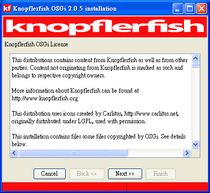 Step 1:從Knopflerfish官網下載knopflerfish_osgi_<version>.jar檔案,透過點擊兩次knopflerfish_osgi_<version>.jar進行安裝過程,此範例使用的是knopflerfish_osgi_2.0.5.jar版本。