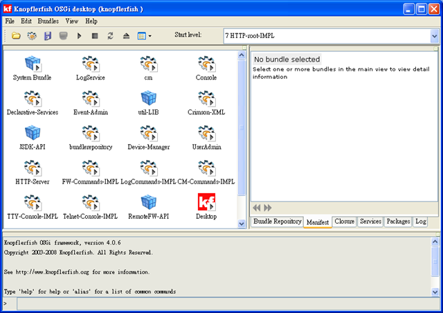 Step 2:在安裝的目錄下,點擊兩次\knopflerfish.org\osgi\framework.jar檔案即可啟動knopflerfish。