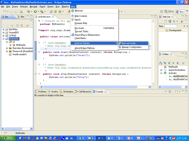 Step 0:確認你的軟體環境,根據官方網站的說法要用Eclipse來掛載Knopflerfish Plugin至少需要Eclipse 3.1版本以上的執行環境,這個範例使用的是Eclipse 3.3的版本