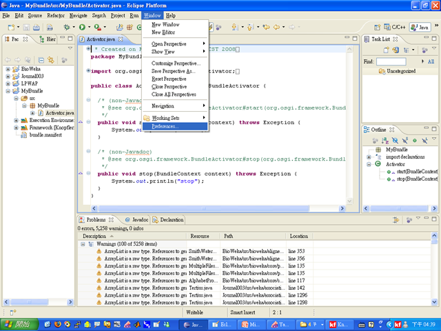 Step 2:選擇Window>Preference設定Eclipse中OSGi的相關設定內容 (非常重要)
