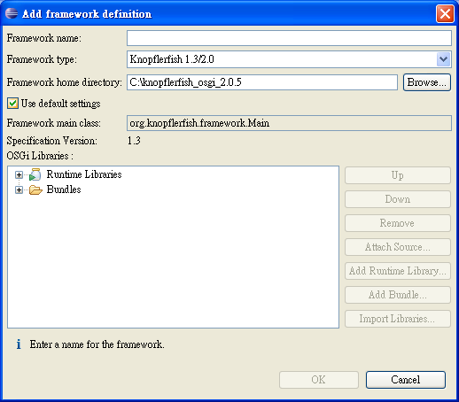 選擇OSGi>framework設定Framework Type並選擇Knopflerfish的安裝目錄