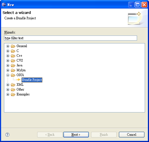 Step 3:開始撰寫OSGi Bundle,選擇產生一個新的Project就會發現Bundle Project,最後點選Finish