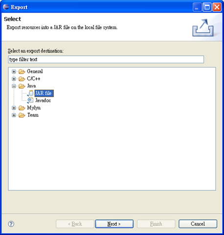 Step 4: 如果要將寫完的程式部屬到Knopflerfish,利用Export將檔案匯出成JAR檔案。
