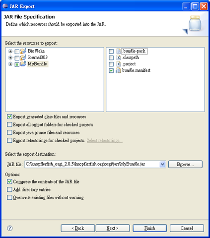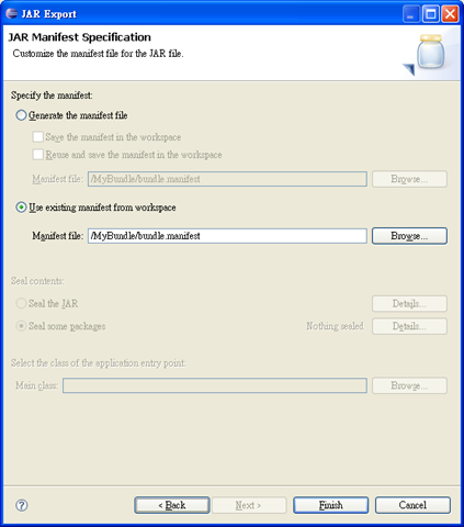 在JAR Manifest Specification中,必許選擇程式中產生之bundle.manifest檔案,之後便可以利用Knopflerfish執行(非常重要)
