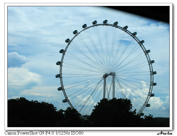 "Singapore Flyer"(圖 5),世界最大的摩天輪平均搭乘一次需要30分鐘,但要價不斐需要29.5塊新幣,這張照片是搭著親切司機大哥的接駁車往飯店途中拍的,雖然我們後來也有去搭乘摩天輪,但很不幸的這是唯一一張"Singapore Flyer"的全景。